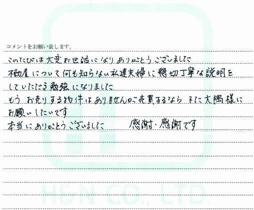 売却にあたっての貴社のアドバイス・手紙など完璧に近い良い仕事でしたので不動産仲介業者に対する認識が良い方向で再認識しました。
